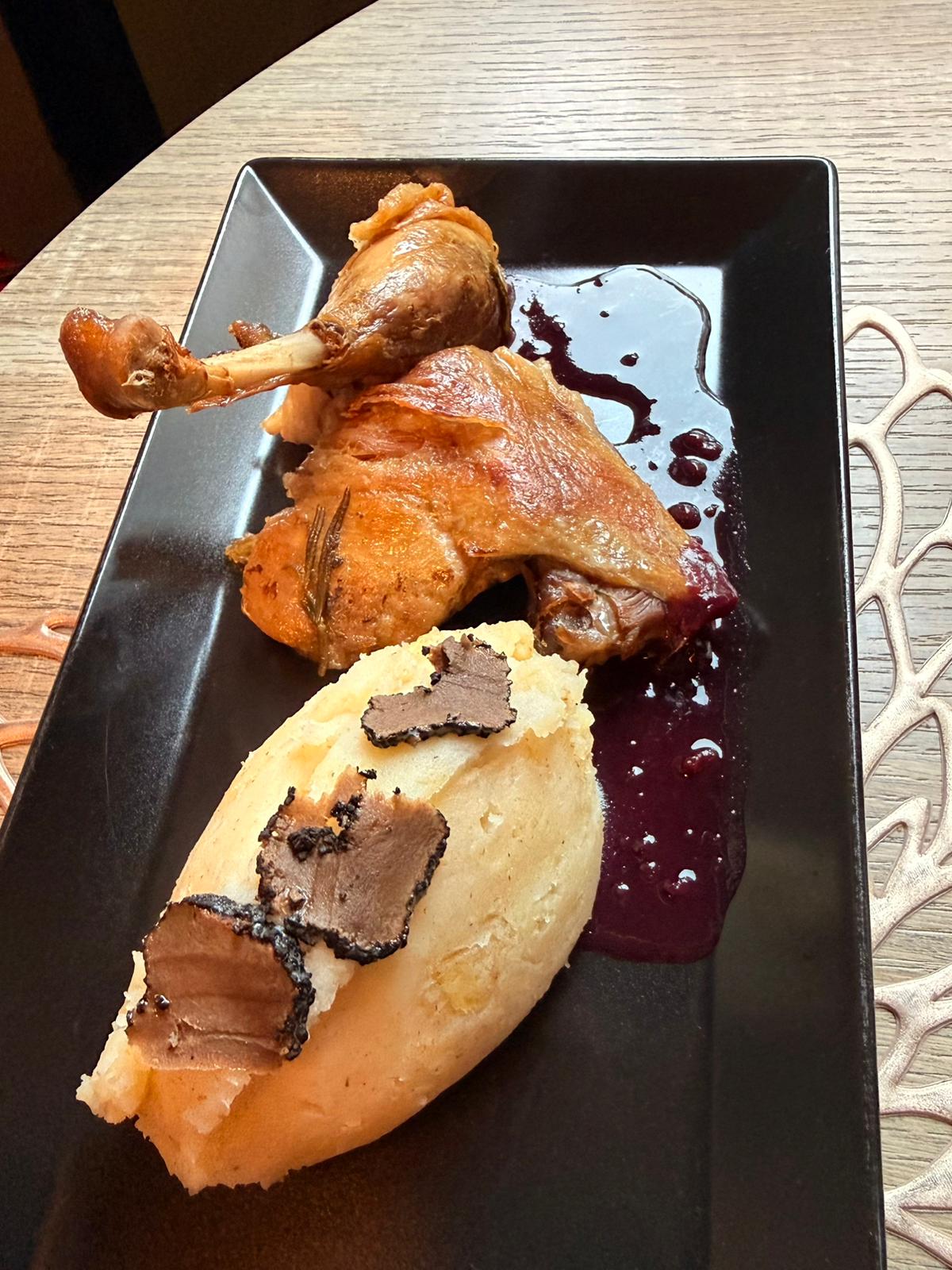 De son côté, mon épouse a choisi une cuisse de canard confite, servie avec une purée aux truffes.